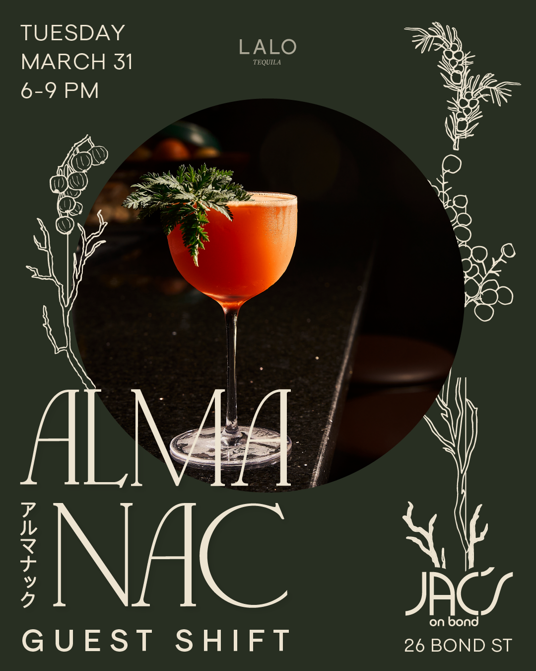 Join us on Tuesday, March 31st for an intimate pop-up with Rob Scott and Beau Quick of Almanac at Jac’s on Bond. Almanac was created in collaboration with James Beard Award–winning Danny Childs of Slow Drinks, and is rooted in seasonality and inspired by the rhythms of nature. Almanac blends Japanese and American influences into a thoughtful, ingredient-driven cocktail experience.